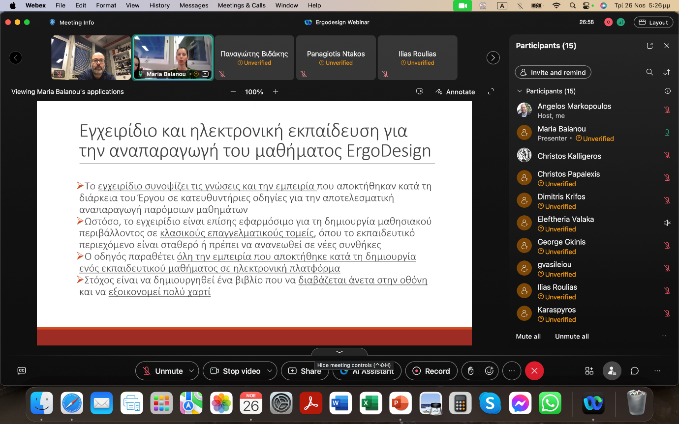 NTUA successfully hosted two webinars for the ERASMUS+ 2021-1-PL01-KA220-HED-000031182 "ErgoDesign – Improving Digital Skills for Ergonomics and Bioengineering Innovations for Inclusive Health Care" on November 26th and November 28th, 2024, in both Greek and English versions. These webinars provided an opportunity for participants to explore the project’s objectives and outcomes. The sessions featured thorough presentations of all Intellectual Outputs, and feedback from attendees was positive.
